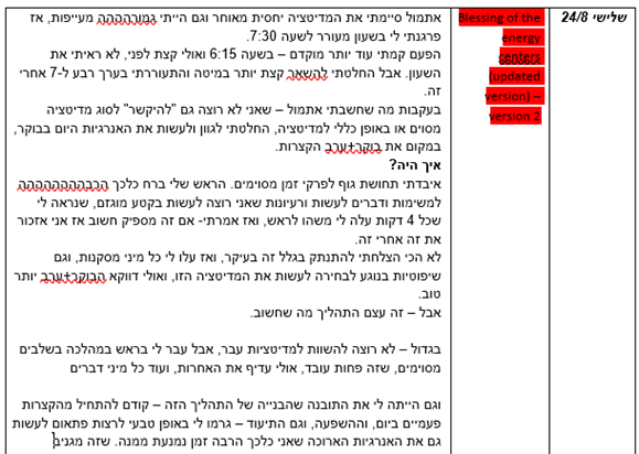 בכדי שהמטרה לא תהיה מעורפלת, כתבתי לעצמי כמה שורות של קווים מנחים – אילו מדיטציות אני רוצה לבצע ומתי. בהתחלה המטרה הייתה לעשות שתי מדיטציות ביום – בוקר+ערב של ג'ו, או שילוב של אחת מהן עם מדיטציות מרכזי הארגיה. אכן ביצעתי את שתיהן ביחד בכל יום למשך שלושה ימים. רציתי להיות מאוד פדנטית עם ההחלטה שלי, ולא משנה מה קורה – לעשות שתיים ביום.